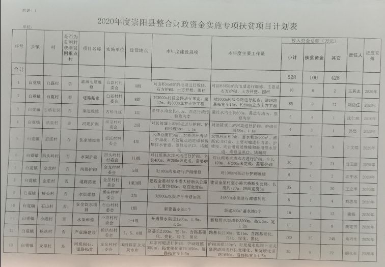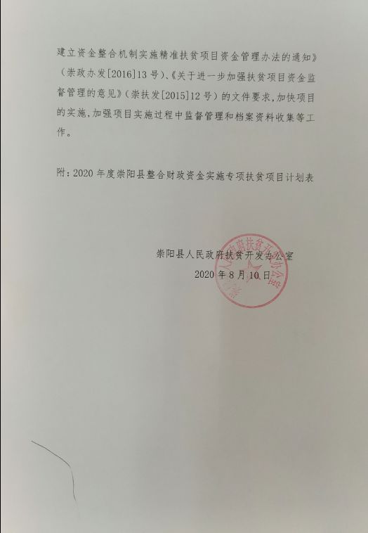 关于下达2020年度崇阳县整合财政资金实施专项扶贫项目计划的通知