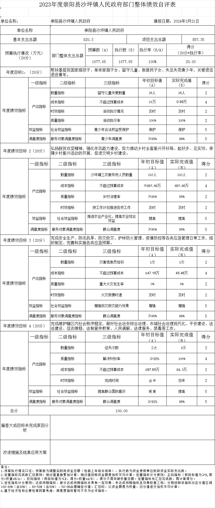 一、2023年度崇阳县沙坪镇人民政府整体绩效评价自评表