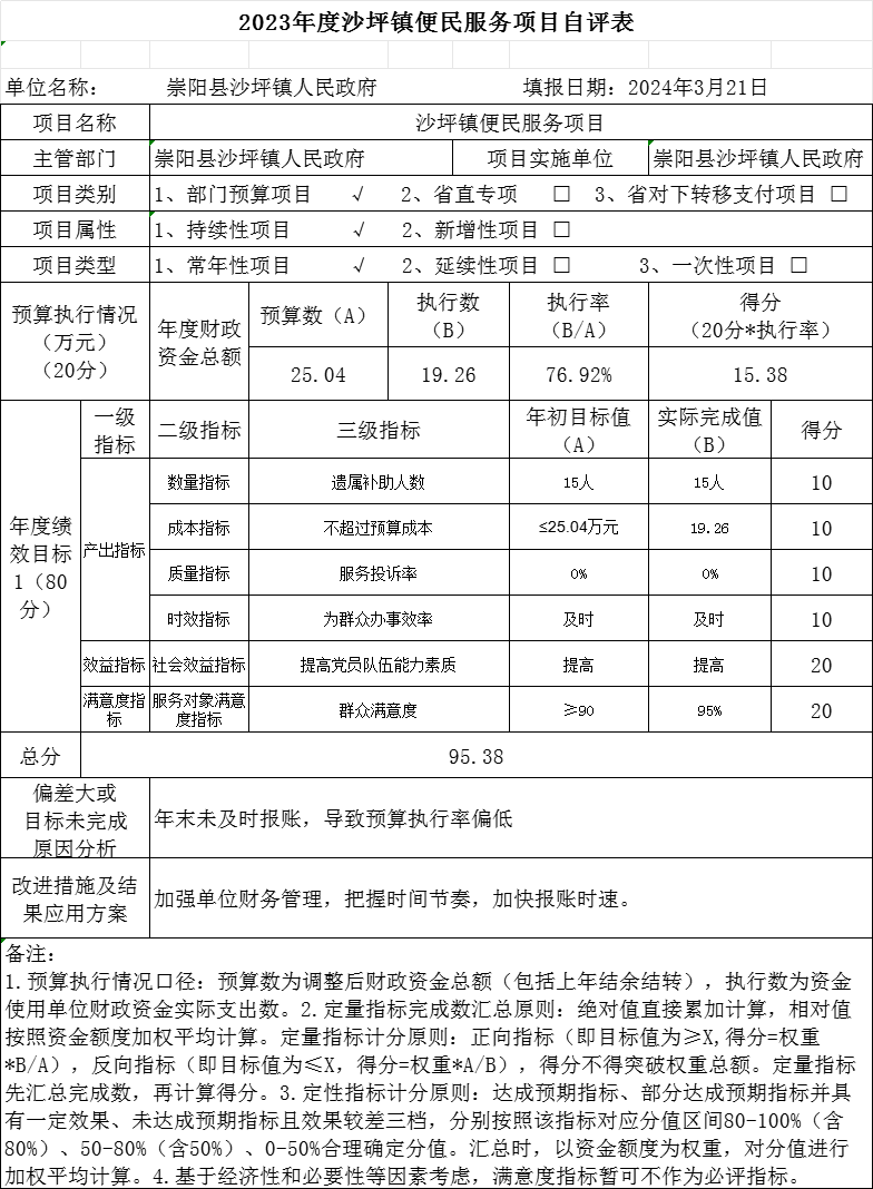 1.2023年度沙坪镇便民服务项目绩效自评综述:项目全年预算数为25.04万元,执行数为19.26万元,完成预算76.92%。主要产出和效益:一是产出指标:数量指标,遗属补助人数15人,实际完成15人,成本指标,不超过预算成本≤25.04万元,实际完成19.26万元,质量指标,服务投诉率为0%,实际为0%,时效指标,为群众办事效率及时,实际为及时;二是效益指标:社会效益指标,提高党员队伍能力素质,实际提高;三是满意度指标:服务对象满意度指标,群众满意度≥90%,实际为95%。发现的问题及原因:年末未及时报账,导致预算执行率偏低。下一步改进措施:加强单位财务管理,把握时间节奏,加快报账时速。