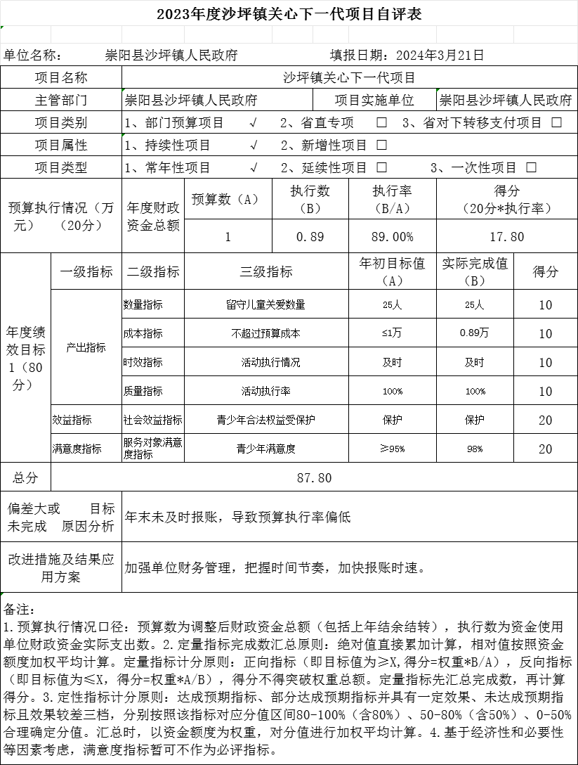 2.2023年度沙坪镇关心下一代项目绩效自评综述:项目全年预算数为1万元,执行数为0.89万元,完成预算89%。主要产出和效益:一是产出指标:数量指标,留守儿童关爱数量25人,实际完成25人,成本指标,不超过预算成本≤1万,实际完成0.89万元,时效指标,活动执行情况及时,实际为及时,质量指标,活动执行率为100%,实际为100%;二是效益指标:社会效益指标,青少年合法权益受保护,实际保护;三是满意度指标:服务对象满意度指标,青少年满意度≥95%,实际为98%。发现的问题及原因:年末未及时报账,导致预算执行率偏低。下一步改进措施:加强单位财务管理,把握时间节奏,加快报账时速。