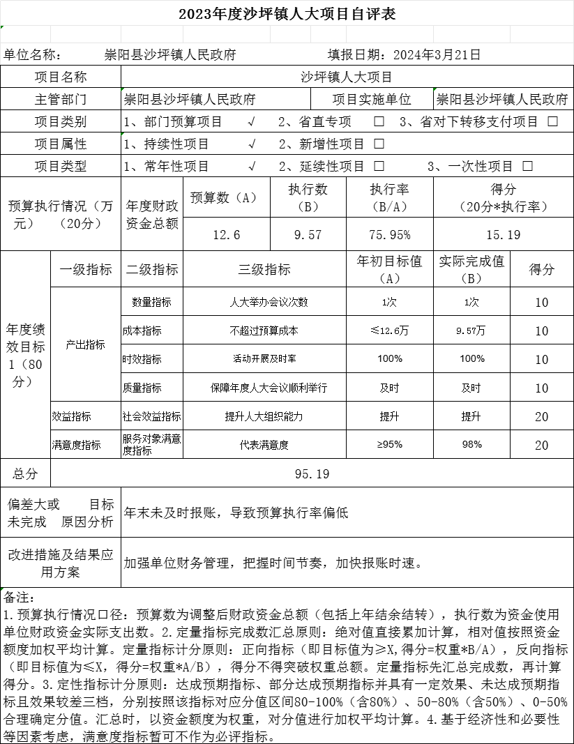 3.2023年度沙坪镇人大项目绩效自评综述:项目全年预算数为12.6万元,执行数为9.57万元,完成预算75.95%。主要产出和效益:一是产出指标:数量指标,人大举办会议次数1次,实际完成1次,成本指标,不超过预算成本≤12.6万,实际完成9.57元,时效指标,活动开展及时率100%,实际为100%,质量指标,保障年度人大会议顺利举行及时,实际为及时;二是效益指标:社会效益指标,提升人大组织能力,实际提升;三是满意度指标:服务对象满意度指标,代表满意度≥95%,实际为98%。发现的问题及原因:年末未及时报账,导致预算执行率偏低。下一步改进措施:加强单位财务管理,把握时间节奏,加快报账时速。