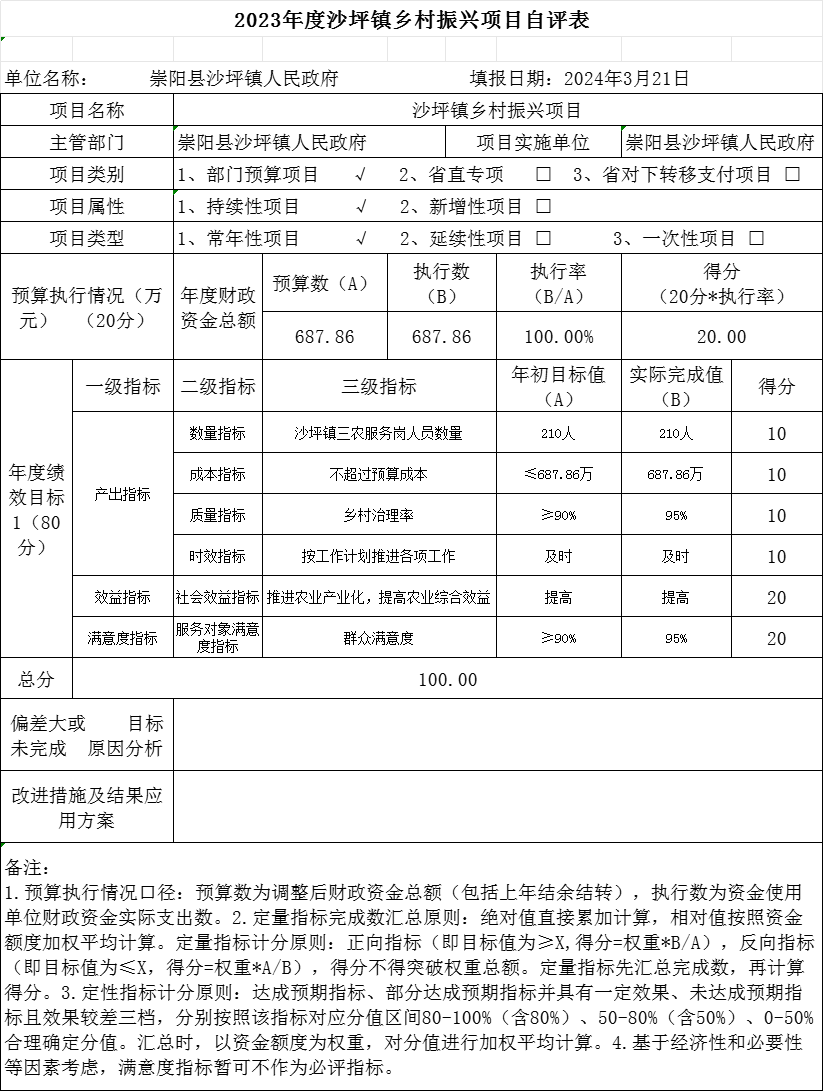 4.2023年度沙坪镇乡村振兴项目绩效自评综述:项目全年预算数为687.86万元,执行数为687.86万元,完成预算100%。主要产出和效益:一是产出指标:数量指标,沙坪镇三农服务岗人员数量210人,实际完成210人,成本指标,不超过预算成本≤687.86万,实际完成687.86万,时效指标,按工作计划及时推进各项工作,实际为及时,质量指标,乡村治理率≥90%,实际为95%;二是效益指标:社会效益指标,推进农业产业化,提高农业综合效益,实际提高;三是满意度指标:服务对象满意度指标,群众满意度≥90%,实际为95%。发现的问题及原因:对绩效评价工作学习还不够到位。下一步改进措施:加强对绩效编制的研究和学习,不断优化绩效目标编制,逐步提高绩效编制的科学性、准确性、完整性,同时加强对绩效编制人员的学习培训,提高编制水平,强化责任意识。
