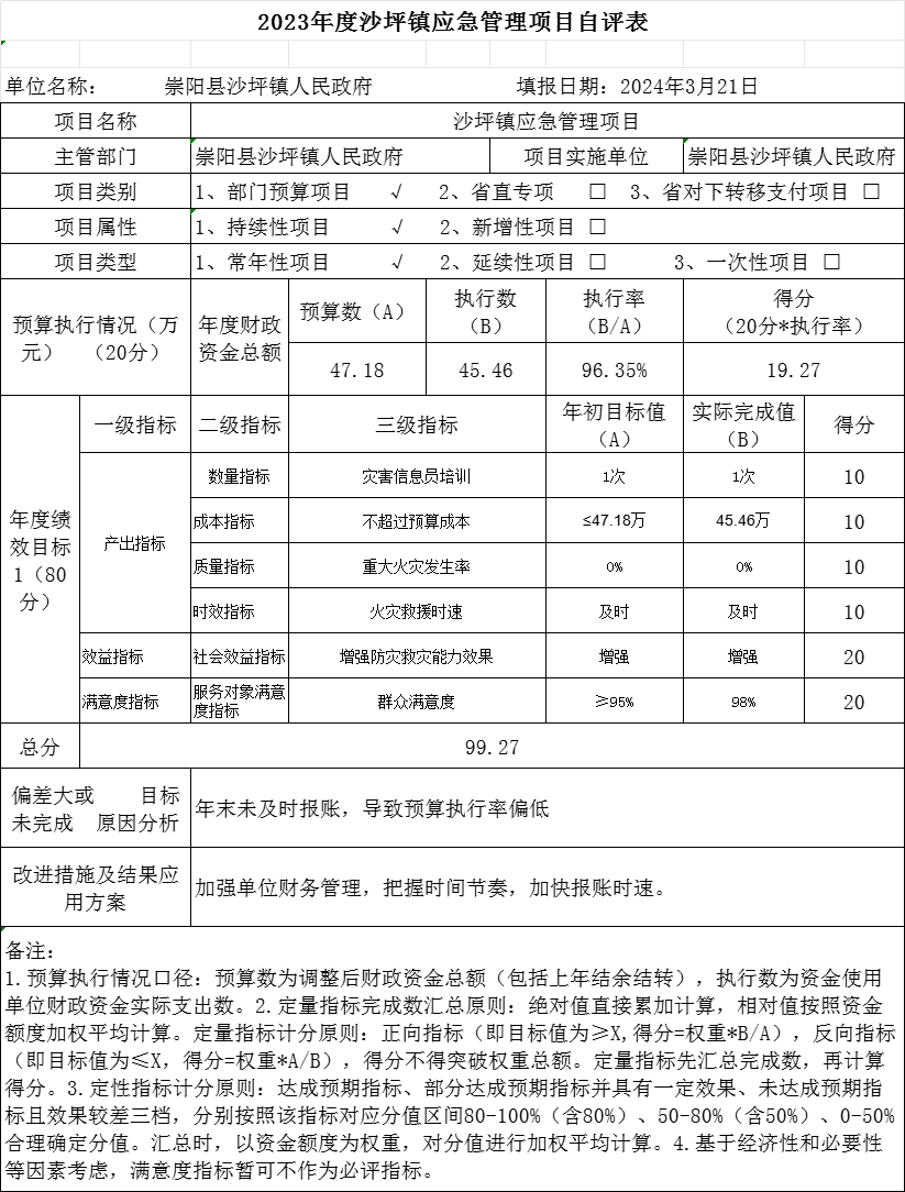 5.2023年度沙坪镇应急管理项目绩效自评综述:项目全年预算数为47.18万元,执行数为45.46万元,完成预算96.35%。主要产出和效益:一是产出指标:数量指标,灾害信息员培训1次,实际完成1次,成本指标,不超过预算成本≤47.18万,实际完成45.46万,时效指标,火灾救援时速及时,实际为及时,质量指标,重大火灾发生率为0%,实际为0%;二是效益指标:社会效益指标,增强防灾救灾能力效果,实际增强;三是满意度指标:服务对象满意度指标,群众满意度≥95%,实际为98%。发现的问题及原因:年末未及时报账,导致预算执行率偏低。下一步改进措施:加强单位财务管理,把握时间节奏,加快报账时速。