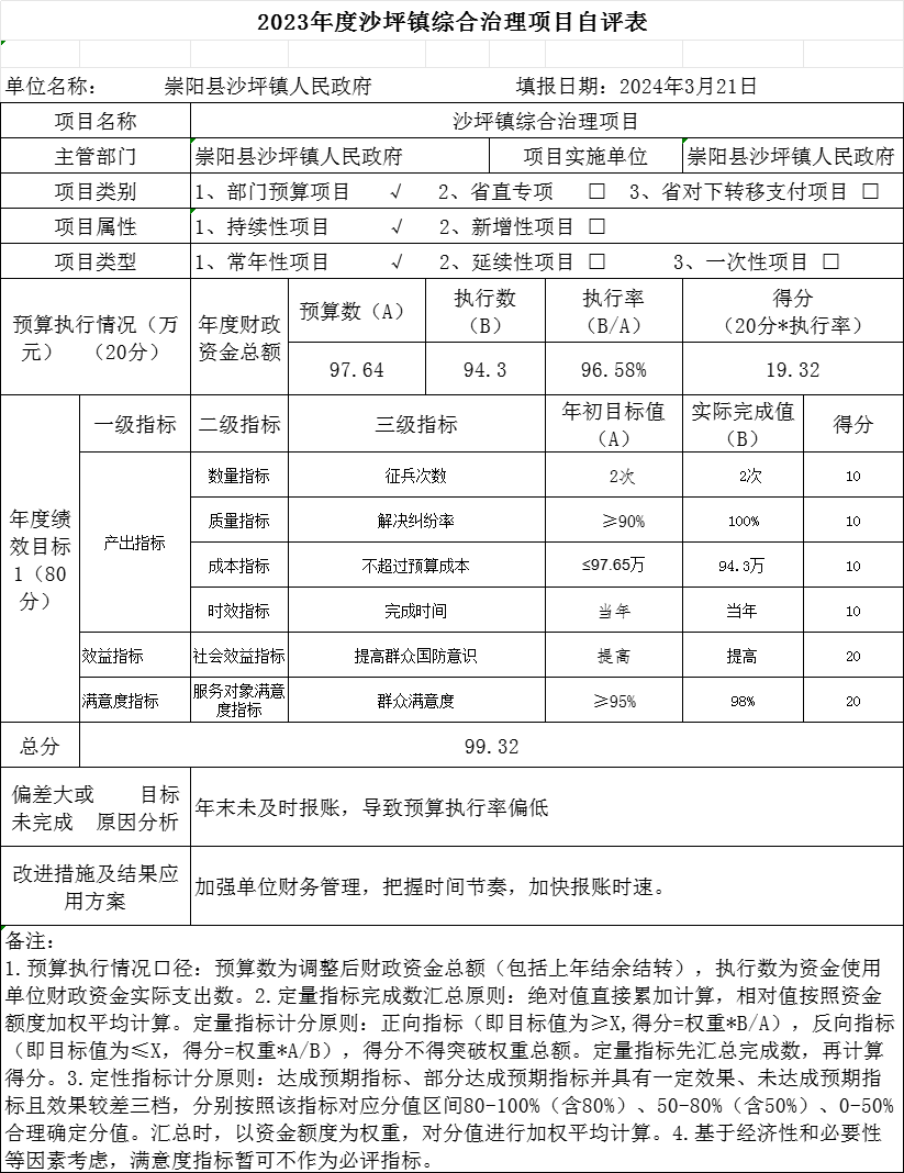 6.2023年度沙坪镇综合治理项目绩效自评综述:项目全年预算数为97.64万元,执行数为94.3万元,完成预算96.58%。主要产出和效益:一是产出指标:数量指标,征兵次数2次,实际完成2次,成本指标,不超过预算成本≤97.65万,实际完成94.3万,时效指标完成时间当年,实际为当年,质量指标,解决纠纷率≥90%,实际为100%;二是效益指标:社会效益指标,提高群众国防意识,实际提高;三是满意度指标:服务对象满意度指标,群众满意度≥95%,实际为98%。发现的问题及原因:年末未及时报账,导致预算执行率偏低。下一步改进措施:加强单位财务管理,把握时间节奏,加快报账时速。
